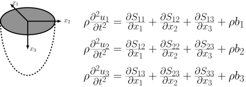 \[\begin{align} \rho \frac{\partial^2 u_1}{\partial t^2} &= \frac{\partial S_{11}}{\partial x_1} + \frac{\partial S_{12}}{\partial x_2} + \frac{\partial S_{13}}{\partial x_3} + \rho b_1 \\ \rho \frac{\partial^2 u_2}{\partial t^2} &= \frac{\partial S_{12}}{\partial x_1} + \frac{\partial S_{22}}{\partial x_2} + \frac{\partial S_{23}}{\partial x_3} + \rho b_2 \\ \rho \frac{\partial^2 u_1}{\partial t^2} &= \frac{\partial S_{13}}{\partial x_1} + \frac{\partial S_{23}}{\partial x_2} + \frac{\partial S_{33}}{\partial x_3} + \rho b_3 \end{align}\]