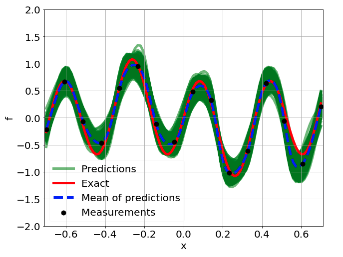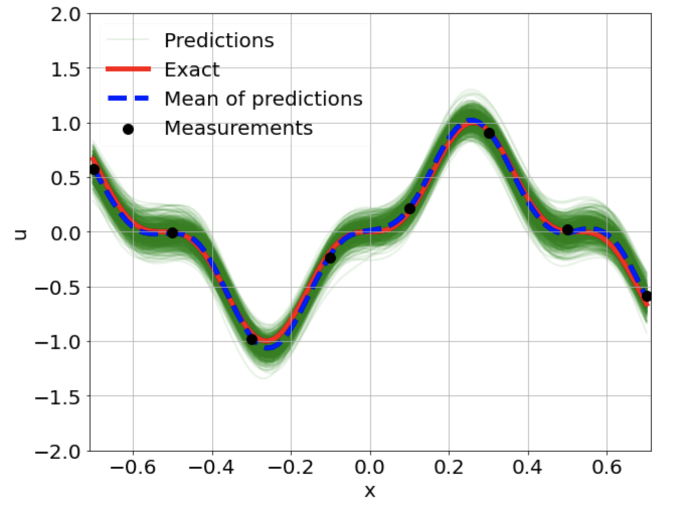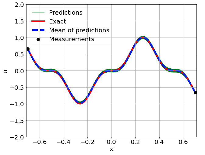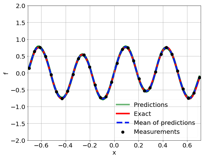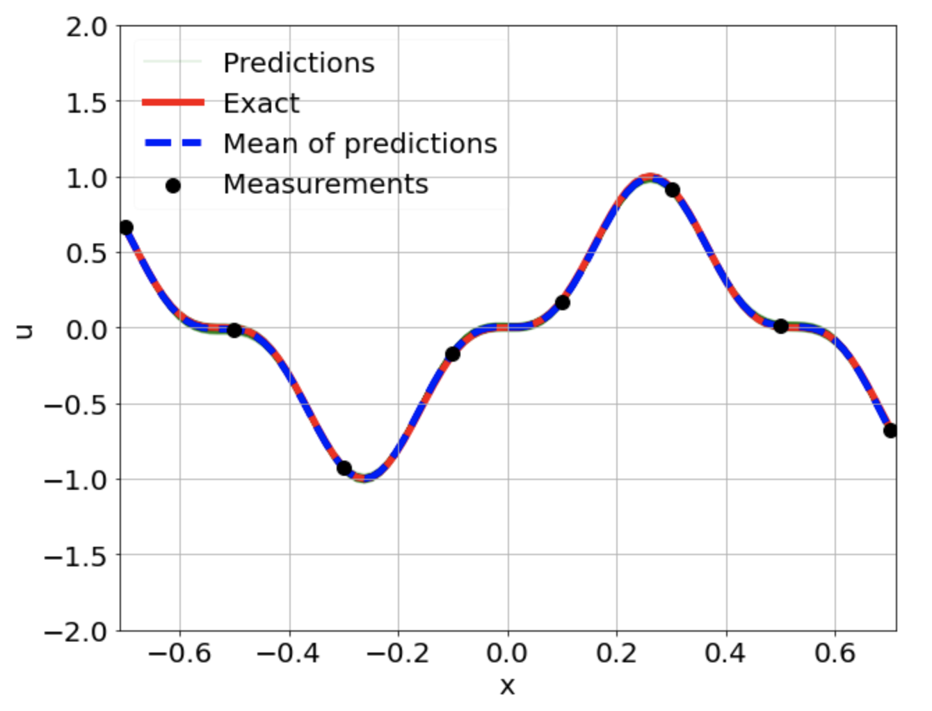 \[ \begin{gathered} \lambda \frac{\partial^2 u}{\partial x^2} + k \tanh(u) = f, \qquad x \in [-0.7, 0.7] \end{gathered} \] where \(\lambda = 0.01, k=0.7\) and \(u=\sin^3(6x)\)