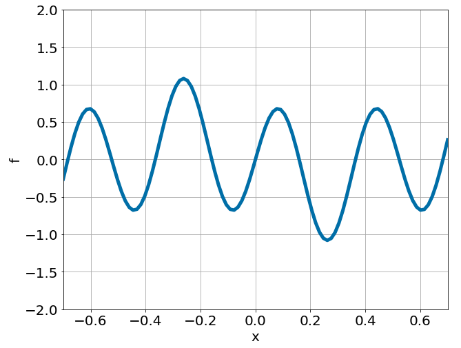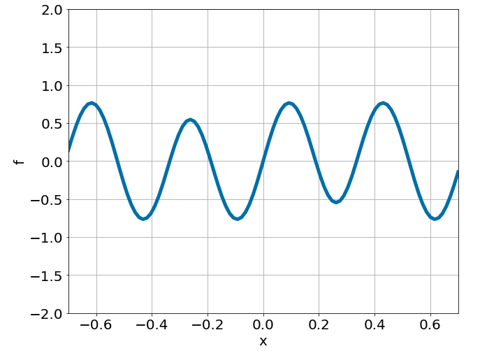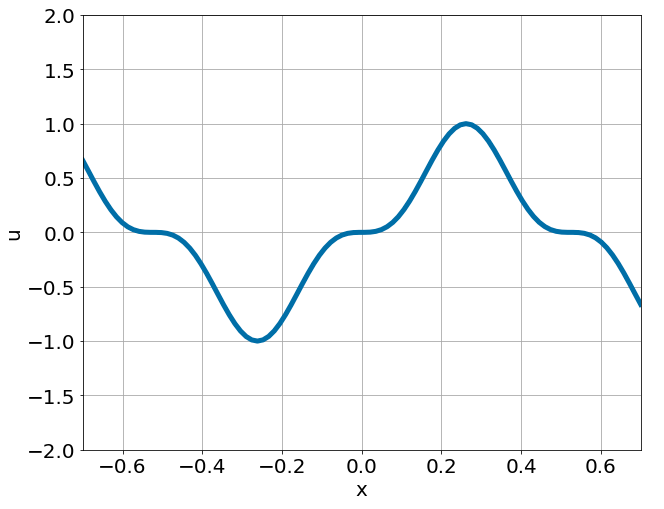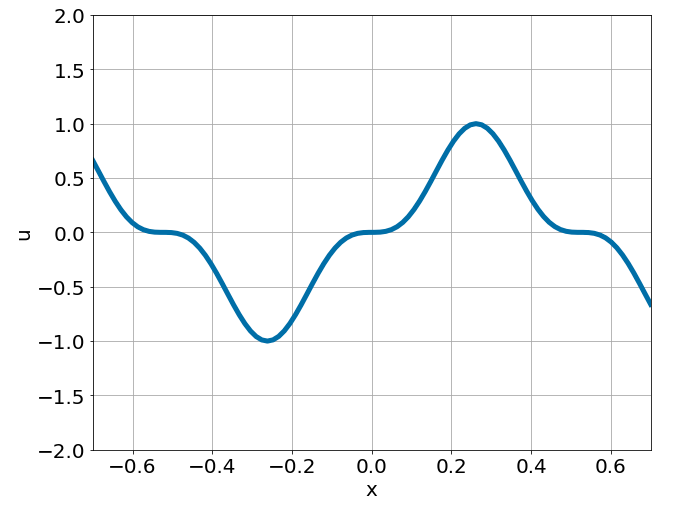 \[ \begin{gathered} \lambda \frac{\partial^2 u}{\partial x^2} = f, \qquad x \in [-0.7, 0.7] \end{gathered} \] where \(\lambda = 0.01\) and \(u=\sin^3(6x)\)