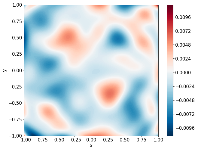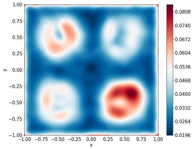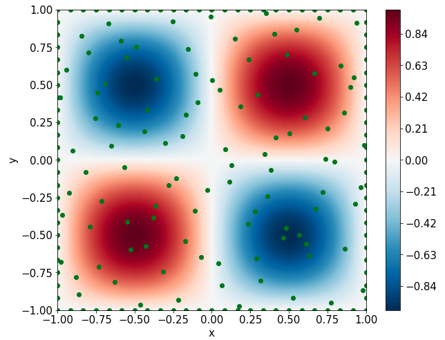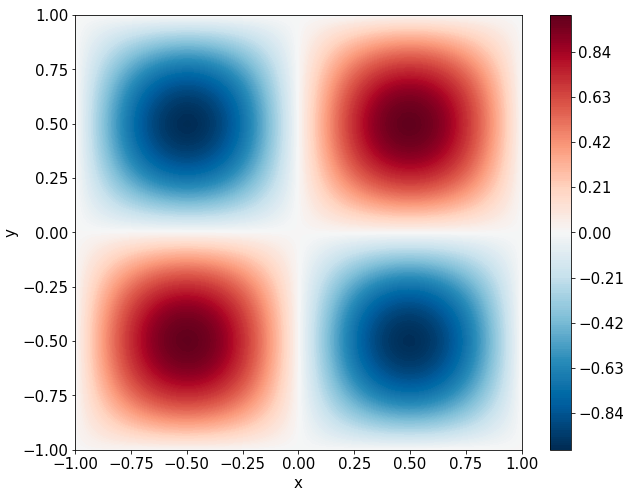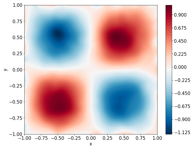 \[ \begin{gathered} \lambda \left(\frac{\partial^2 u}{\partial x^2} + \frac{\partial^2 u}{\partial y^2}\right) + u\left(u^2 -1 \right) = f, \qquad x,y \in [-1, 1] \end{gathered} \] where \(\lambda = 0.01\) and \(u=\sin(\pi x)\sin(\pi y)\)
